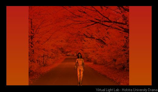 This feels like a fall sunset in Vermont because of the intense reds and burnt orange, in a lot of my research of sunsets in Vermont specifically I kept coming across these intense reds and oranges and really wanted to incorporate that in this design. Also, the distribution of color on the model is really interesting and the use of the texture makes in look like she’s really standing amidst the tress with sun coming at her at an angle.