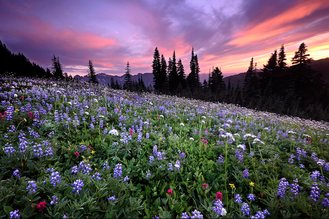 4) This is a photo of Mt. Rainier in Washington State taken at sunset. This picture is so beautiful because somehow Miles catches the sky at the exact right moment when the colors in the sky directly reflect the colors of the flowers on the mountain. All of the shades of purple, pink, yellow, and white come together to form a calm, peaceful vision of a beautiful mountaintop. The trees are back lit from the sun setting, which creates a nice contrast between the black of the back lit trees and the warm pastels of the flowers and sky. The view of the mountains in the background is not completely back lit, so they take on a nice mid tone of purple, which calms the contrast between the black and the light, warm pastels so it is not overwhelming.