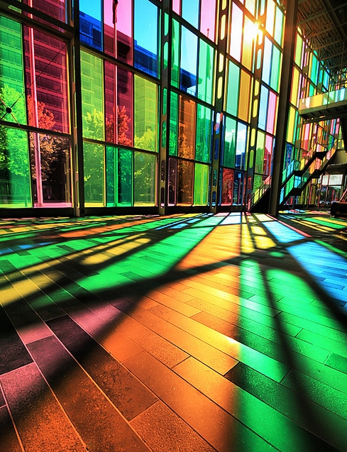 4) This photo depicts the shadow from sunlight blaring through a beautiful wall of colored windows. The wall itself is a beautiful rainbow of color. Since the sun is at an angle, the shadows from the windows are cast so that it feels like cans of paint of all of the colors of the rainbow have spilt across the floor towards us.