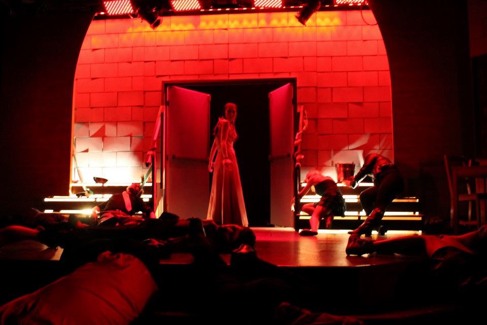 A darknened border encapsulates the glowing red aura like a hot branding iron as it blares bright red, fresh from the flame. A blazing rainbow of warm hues scorching the outmost edges of the centered set send forth a rain of fiery intensity upon the fallen actors. A flame of white light illuminates the bottom downstage staircase on each edge of the stage. The red-tinted silhouettes of life-less bodies sprawl across the floor under the suffocating power of the heat. One single survivor remains standing, about to enter into the cool abyss of black waiting behind the melting doors.