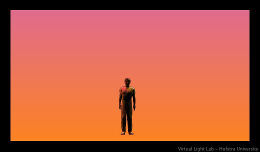 There are five lights on the models. There is a front light with a 0 degree elevation angle, a 56 degree side angle, a LHT020 gel, and 49% intensity. There is a sidelight with a 0 degree elevation angle, a L793 gel, and 54% intensity. There is a front light with a 23 degree elevation angle, a 56 degree side angle, a LHT254 gel, and 77% intensity. There is a backlight with a 23 degree elevation angle, a 56 degree back angle, a L704 gel, and a 51% intensity. There is also a sidelight with a 37 degree elevation angle, a L135 gel, and 74% intensity.The cyclorama is lit from the top by a light with a RE202 gel and 40% intensity, a light with a RE219 gel and 31% intensity, a light with a L010 gel and 25% intensity, and a light with a R377 gel and 75% intensity. It is lit from the bottom by four lights as well: a light with a R24 gel and 39% intensity, a light with a YELLOW gel and 46% intensity, a light with a RE002 gel and 20% intensity, and a gel with a L172 gel and 20% intensity.The lighting is appropriate for the moment because the light on the models comes from one general area. This area could be understood to be the sun rising. The colors are warm and diverse but gentler, less intense, and less vibrant than the colors in the fall picture. The sunlight might catch some flowers or flowering trees that are blooming as it rises but it would not be as overwhelming as the changing colors of leaves in Vermont in fall. - Noon on a hot Summer day in Hawaii